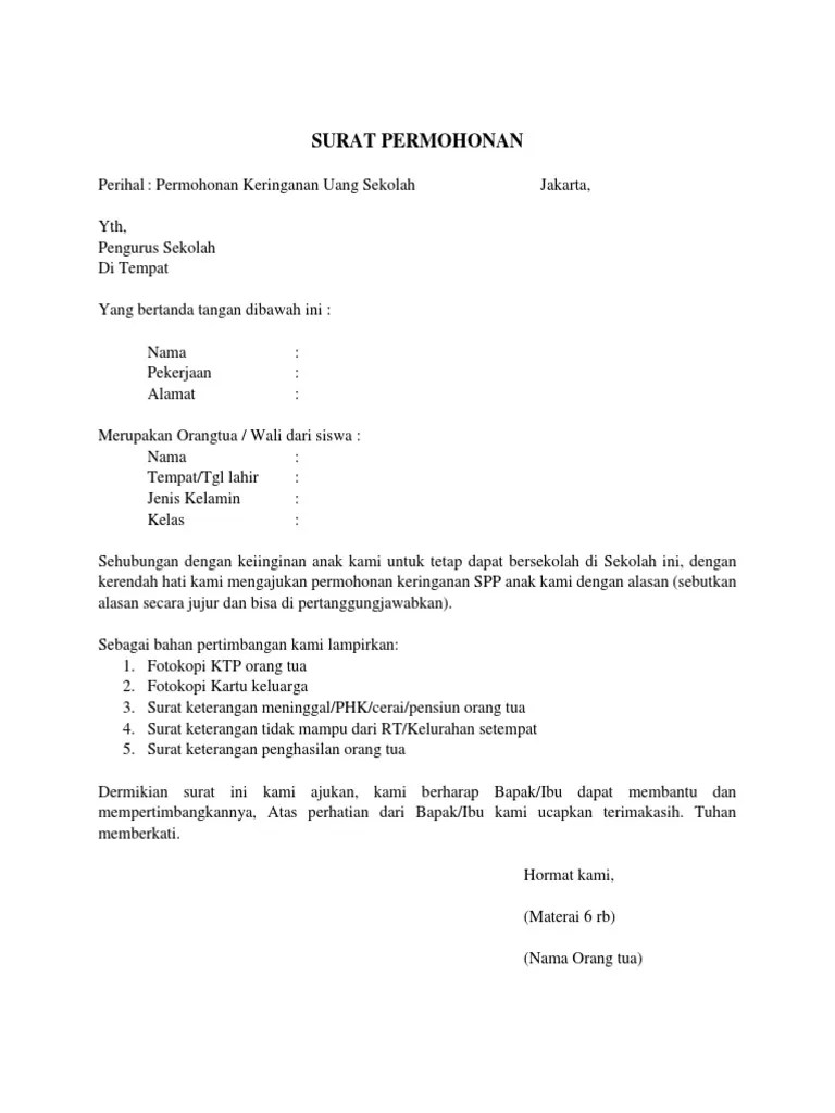 Tata cara pengurangan atau penghapusan sanksi administrasi . Contoh surat lamaran kerja guru sd smp dan lembaga kursus . Surat permohonan keringanan biaya sppkepada yth. Surat permohonan adalah 17 contoh keseharian di 2021 surat belajar sekolah . Contoh surat permohonan keringanan biaya sewa gedung aula tanda surat smp.